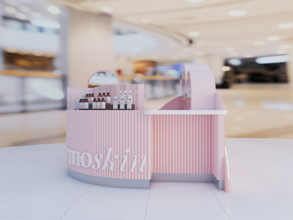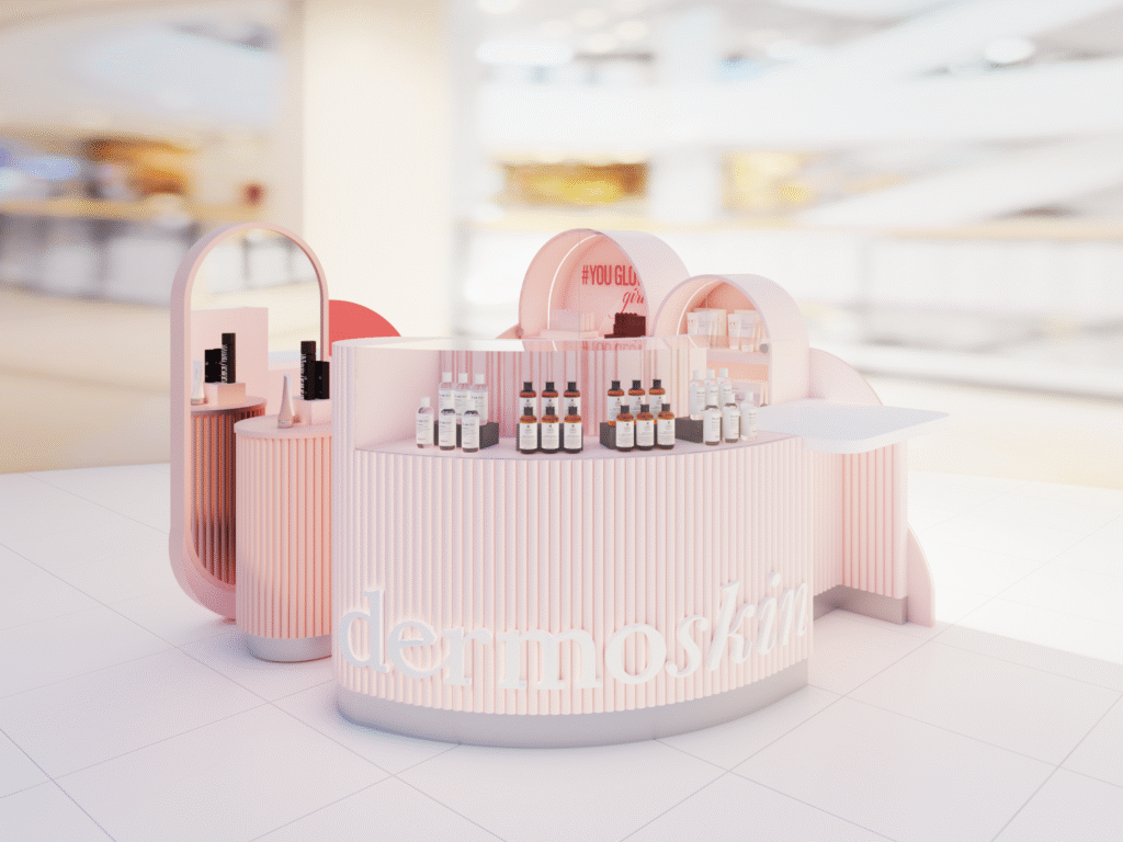 Este módulo fue diseñado para representar a la marca Dermoskin dentro de un espacio comercial, priorizando una imagen limpia, profesional y cercana al mundo del cuidado personal y la salud dermatológica.